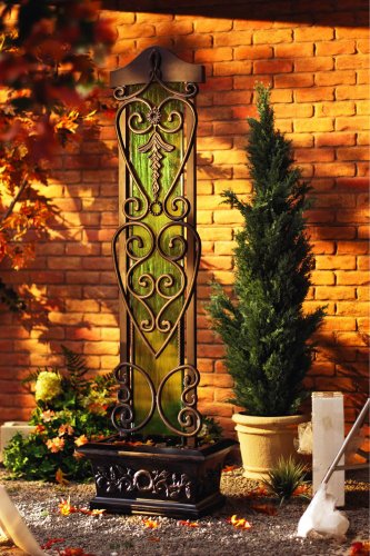 Indoor Design-Outdoor Safe! Free Shipping-Limited Time! The perfect accent to a patio, deck, porch or any outdoor living space. This elegant and decorative indoor/outdoor floor fountain uses a vertical tinted green plate glass waterfall framed with bronze colored cast iron and aluminum sides. The elegant design of the arched header and classical design pedestal reservoir give the unit an unmatched authentic look. Bronze Powder Coated Dimensions 74"H x 24"W x 18"D Pump Included Ideal for Indoor/Outdoor Use 1 year Warranty