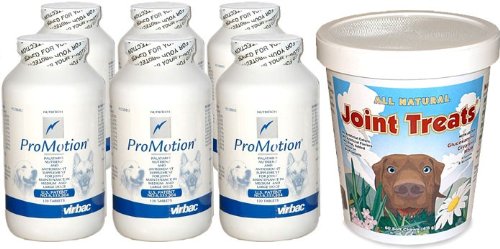 For a limited time only, this special 3-PACK offer comes with a FREE tub of Joint Treats!ProMotion is a palatable nutrient and antioxidant supplement for joint maintenance in dogs. Each tablet contains 700 mg glucosamine. Dosages: 13-25 lbs: 1/2 tablet per day. 26-50 lbs: 1 tablet per day. 51-80 lbs: 2 tablets per day. Over 80 lbs: 3 tablets per day.